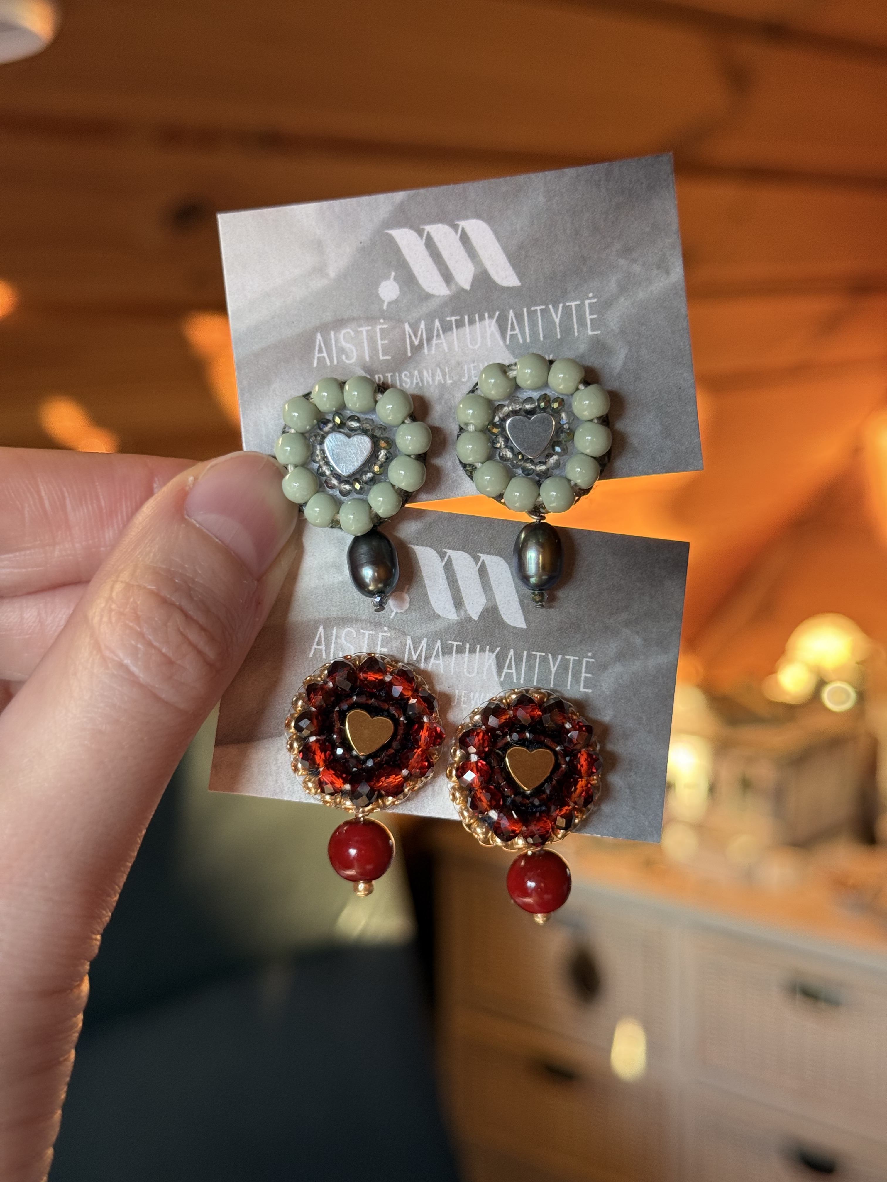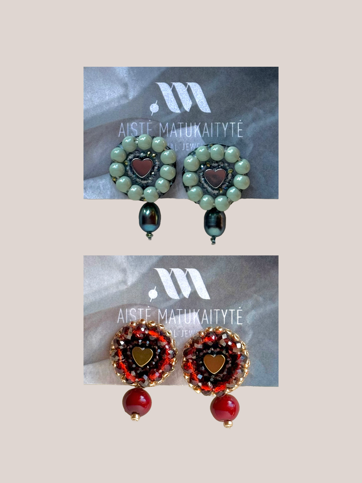 Auskarai siuvinėti naudojant karoliukų siuvinėjimo techniką, todėl kiekviena pora yra unikali. Galimi du spalviniai variantai – žalia ir raudona, leidžiantys pasirinkti nuotaiką pagal savo stilių. Taip pat galima nusegti kabančią detalę (perlą arba karoliuką) ir nešioti auskarus be jų.
